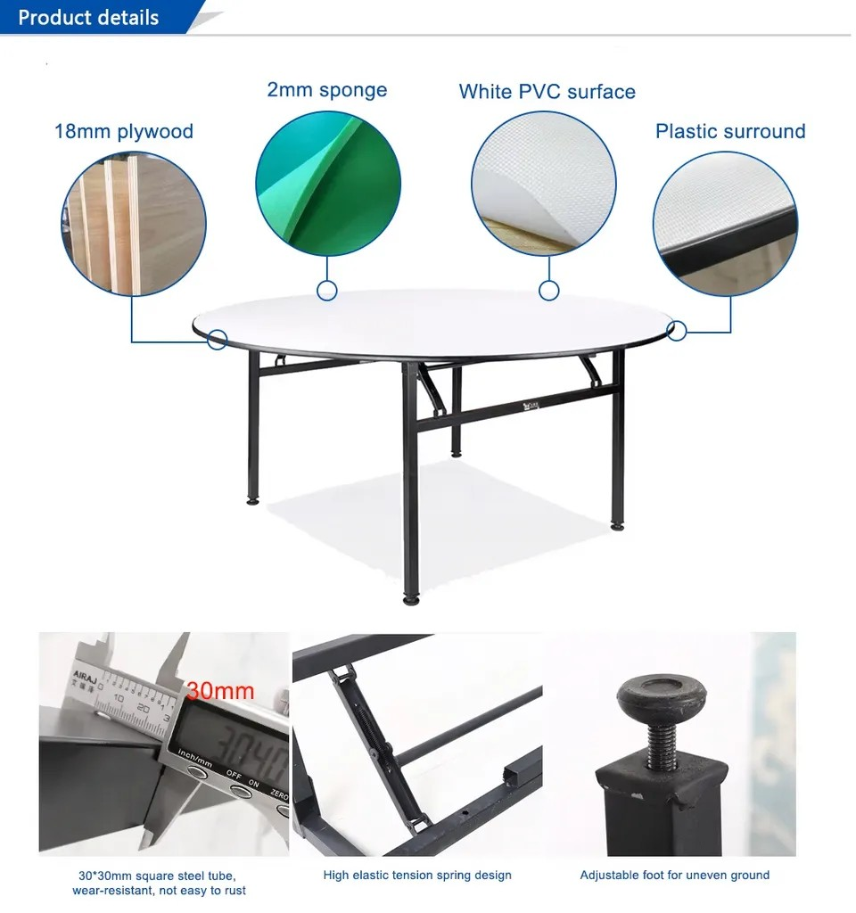 Host events with ease and style using the 1.5M Round Foldable Banquet Table, designed for convenience, durability, and versatility. Its spacious 1.5-meter diameter surface provides ample room for dining, meetings, or display purposes, while the foldable design allows for effortless storage and transport. Crafted from high-quality materials, this table is stable, sturdy, and built to withstand frequent use in banquet halls, parties, conferences, or outdoor gatherings. Combining practicality with a sleek, professional appearance, it’s the perfect solution for both personal and commercial event needs.