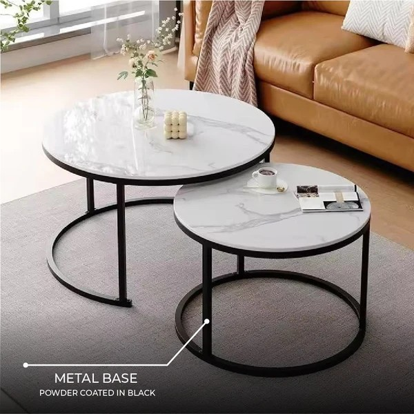 The smaller table conveniently nests under the larger one, allowing you to save space or create a layered display. This versatile design makes it perfect for entertaining guests, holding drinks, snacks, decorative items, or magazines. Its sleek, modern style effortlessly complements various interior themes, from contemporary and minimalist to classic and eclectic.