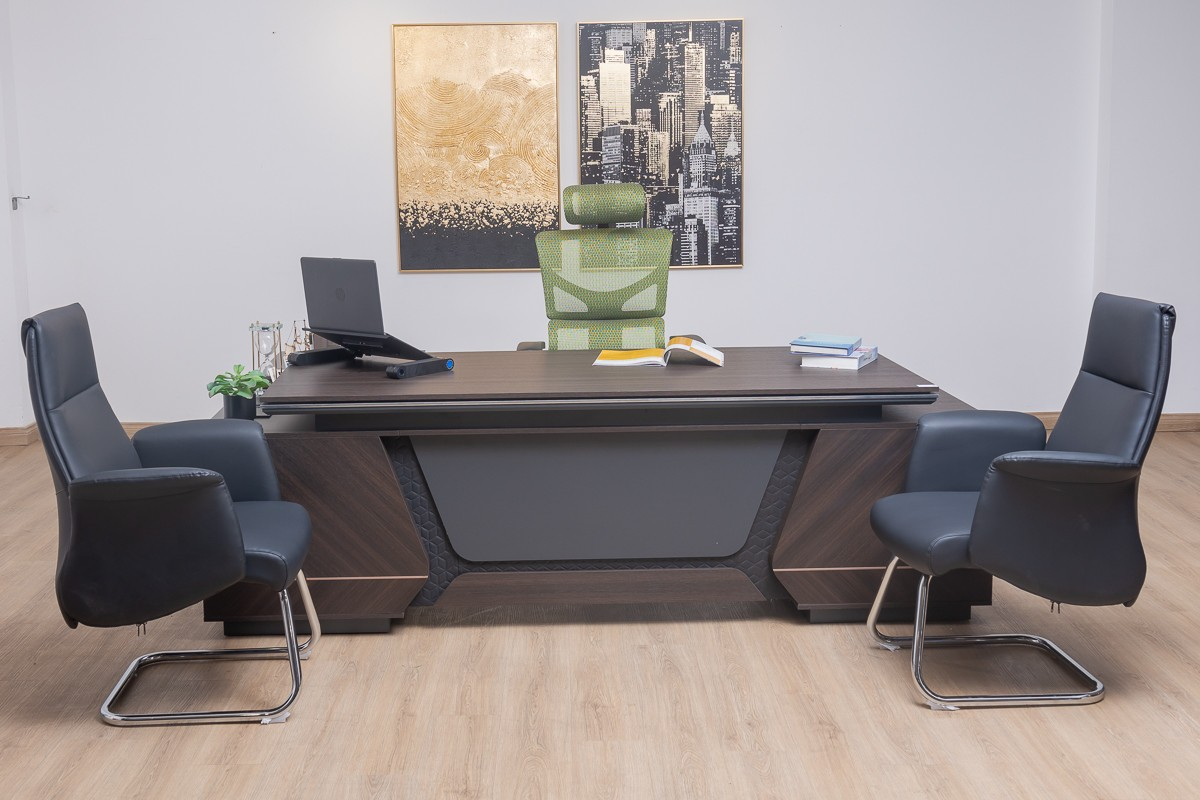 Crafted from high-quality engineered wood and premium laminates, the desk is both sturdy and visually appealing. Reinforced panels and strong metal supports ensure stability and long-lasting performance. Its elegant finish adds a modern, professional aesthetic to any office, complementing executive chairs, cabinets, and boardroom furniture.