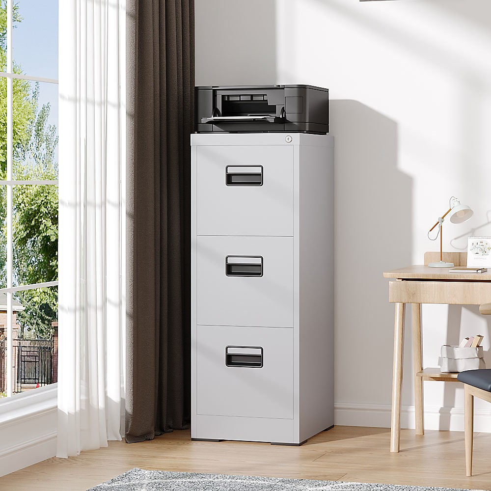The cabinet features three spacious drawers that provide ample storage for files, folders, and supplies. Each drawer is designed for smooth operation, allowing easy access while keeping contents neatly arranged. The vertical drawer layout helps maximize floor space, making it suitable for both small and large offices.