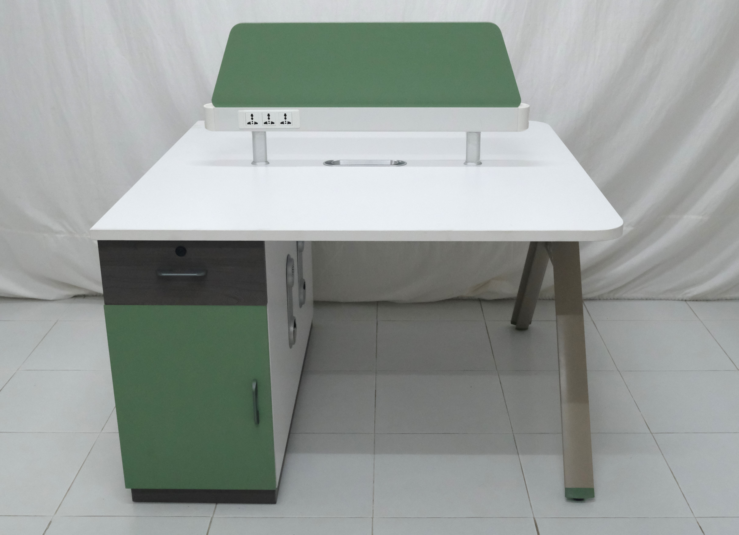 The workstation includes built-in storage options, such as drawers or shelves, to keep office supplies, documents, and personal items neatly organized. These practical features reduce clutter and enhance workflow efficiency, ensuring a tidy and professional workspace for both users.