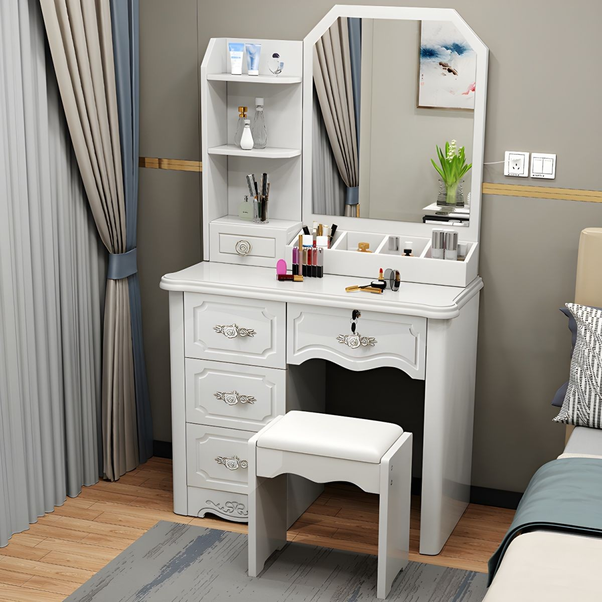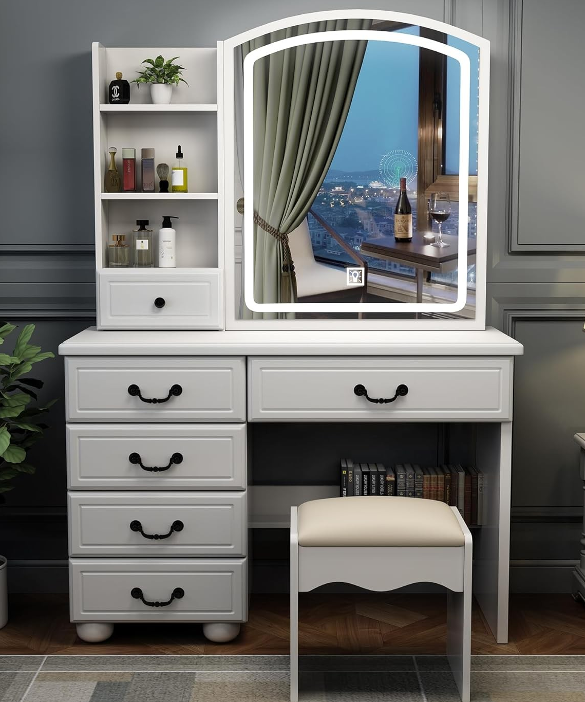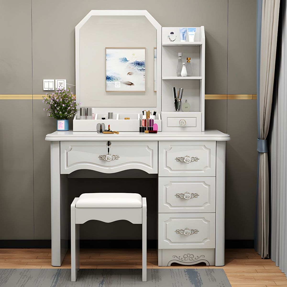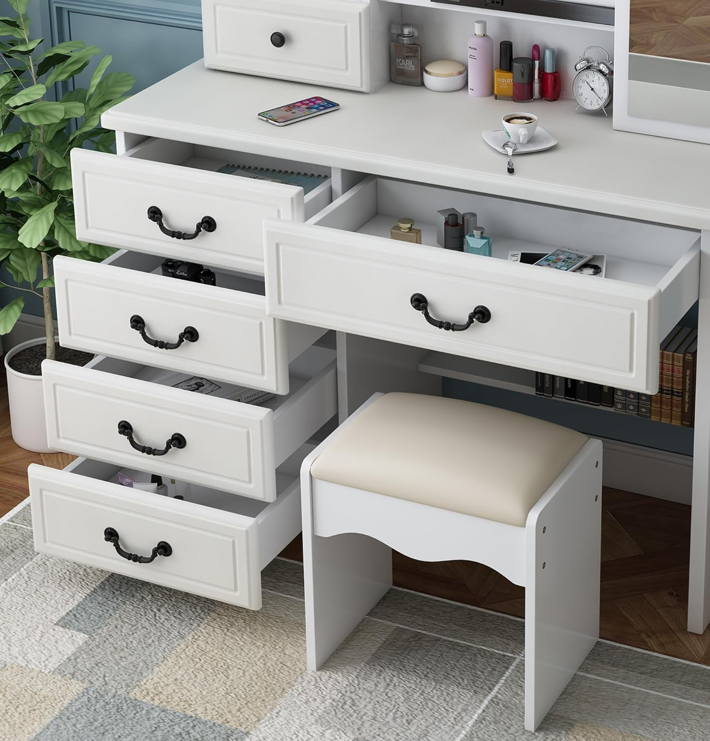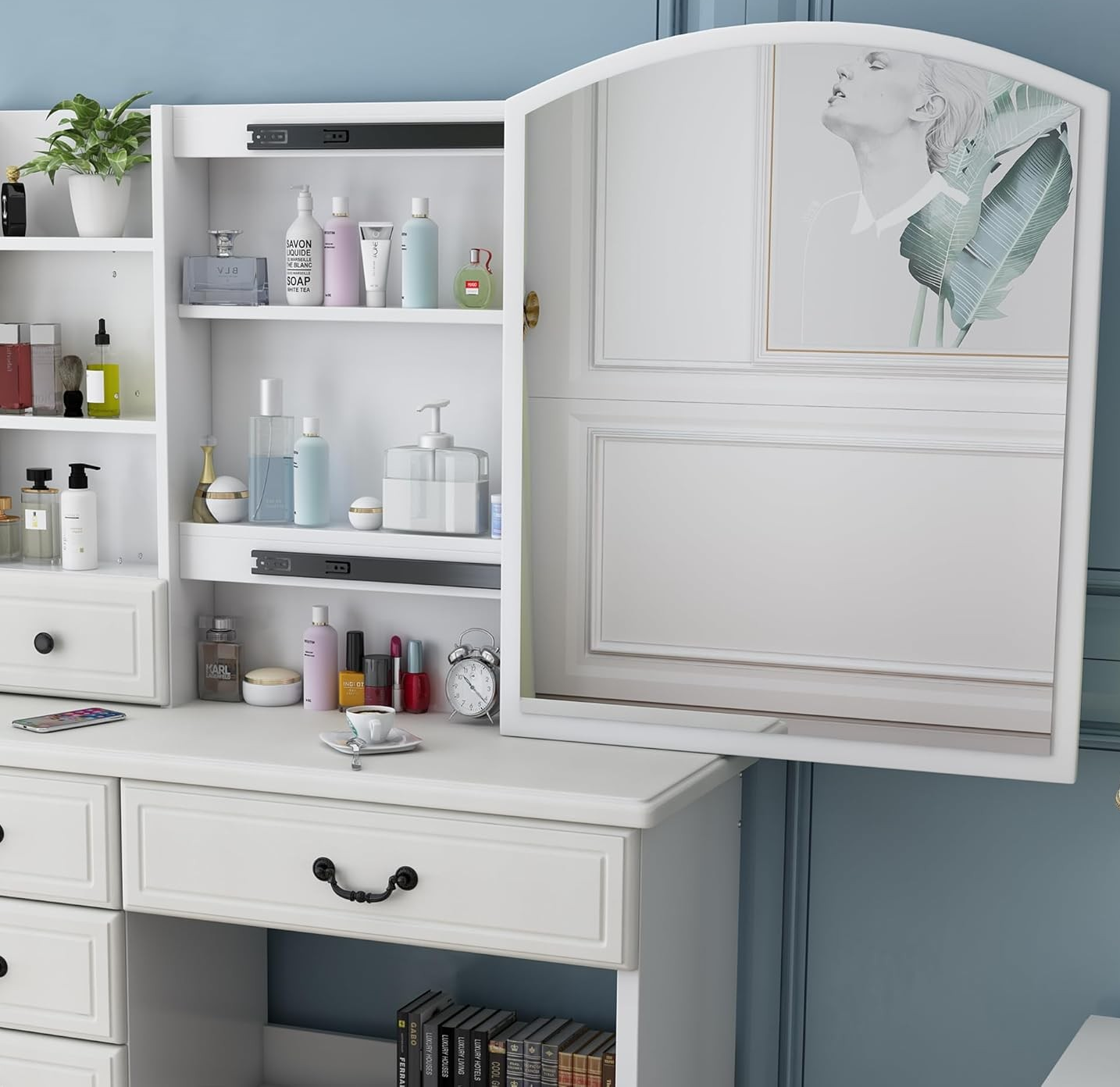 This dressing table features multiple drawers and compartments for efficient storage of makeup, skincare products, jewelry, hair tools, and personal items. The organized design keeps your essentials within easy reach while maintaining a clutter-free space. Some models may include adjustable compartments to accommodate larger items like hairdryers or beauty kits.