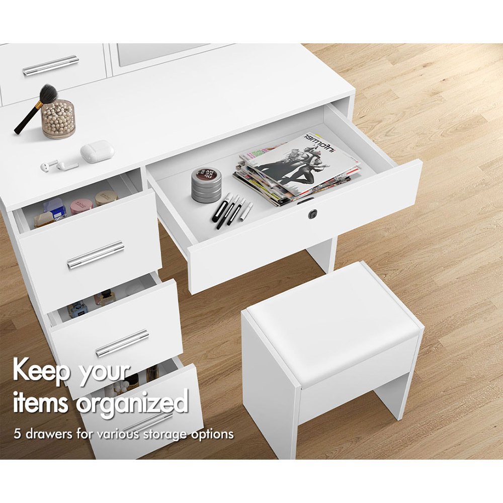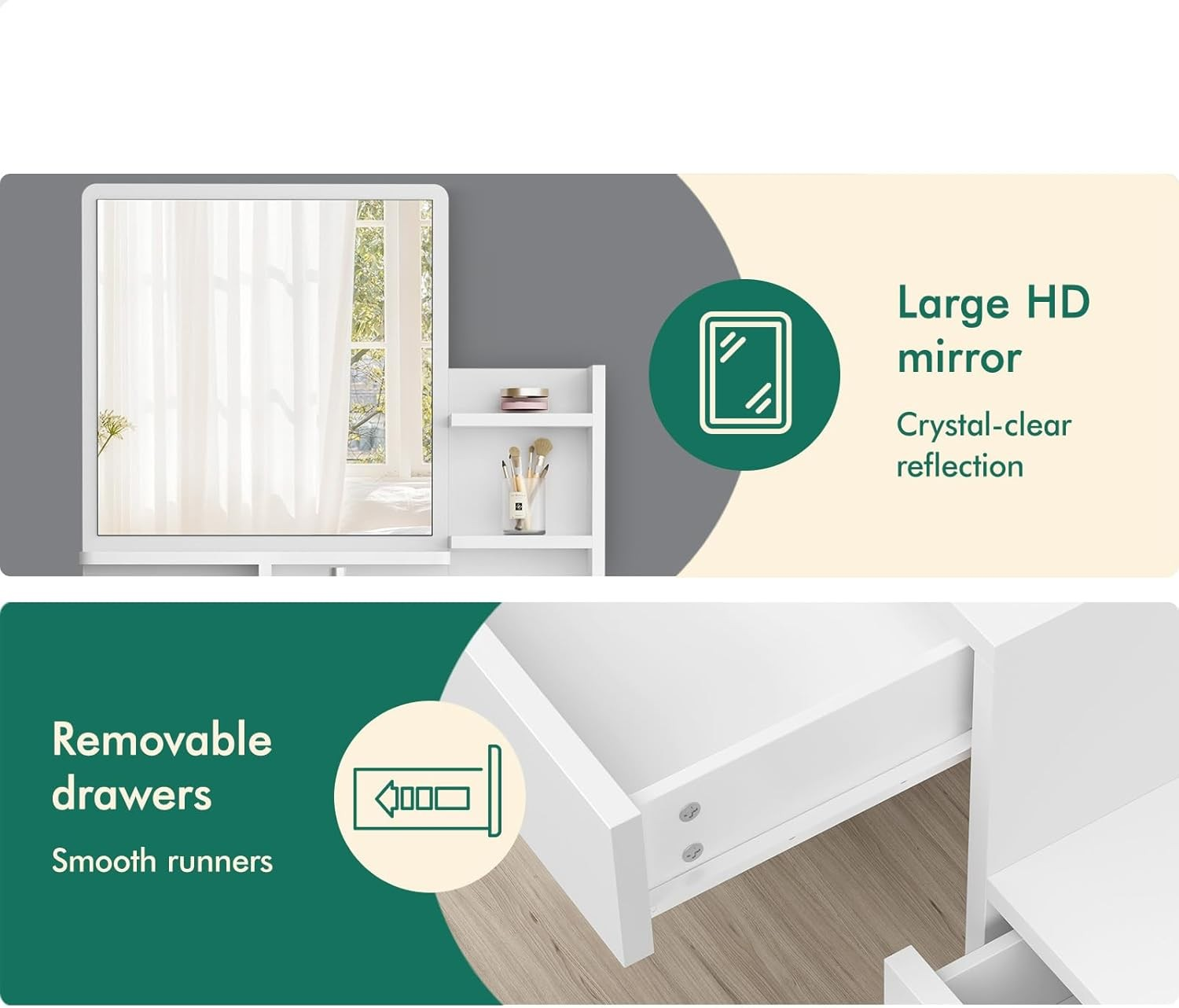 The vanity features a generous tabletop for makeup products, brushes, skincare items, and personal accessories. Its smooth surface is easy to use and clean. The included drawers offer organized storage for cosmetics and small items. This design keeps your space tidy while keeping essentials within reach.